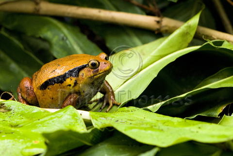 A Tomato Frog (Dyscophus antongilii), prepares to leap for better cover.