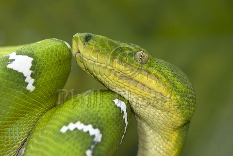 An Emerald Tree Boa (Corallus caninus), rests its head on its coiled up body.