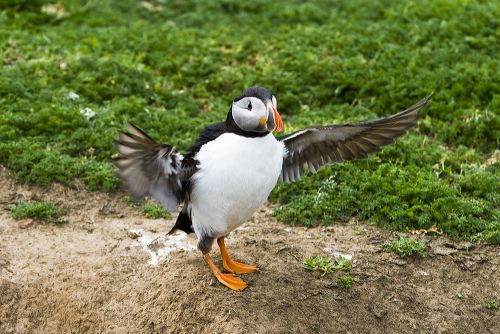 Puffin (Fratercula arctica) Stretching its wings Skomer Island