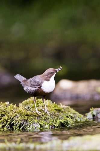 DIPPER, (Cinclus cinclus), pauses beneath nest with bill full of invertebrates.