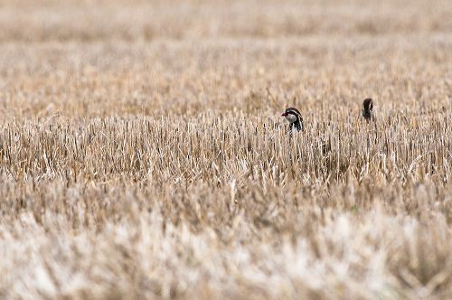 Two Red-legged Partridge (Alectoris rufa), Peer over the tops of the corn stubble.