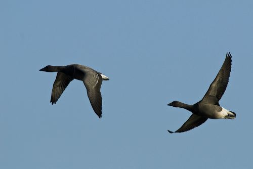 A Pair of Dark-bellied Brent Geese (Branta bernicla) in flight at Snettisham Reserve Norfolk