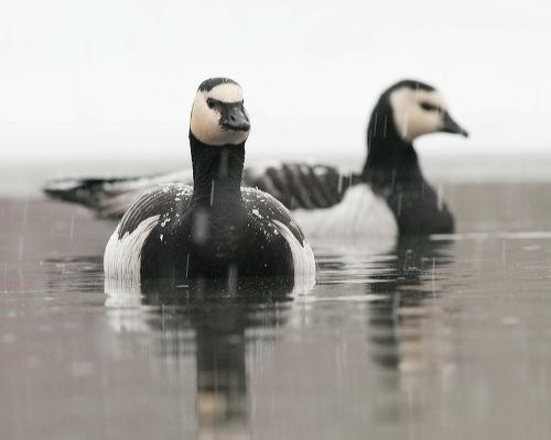 A Pair of Barnacle Geese swimming during a snow flurry.