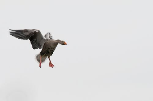 A Greylag goose looks in disbelief at the shallow water of a rapidly shrinking lake as it comes in to land.