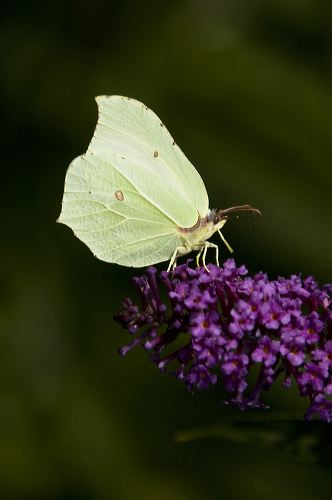 A Yellow Brimstone butterfly (Gonepteryx rhamni), feeding on the butterfly bush or Buddleia (Buddleja davidii).