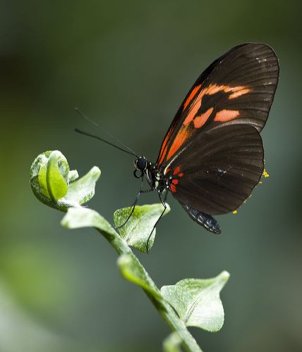 A Small Potman butterfly (Heliconius erato) rests on a leaflet.