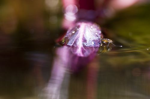 A Pond Skater nymph gets support from a Lobellia cardinallis leaf at the waters surface.
