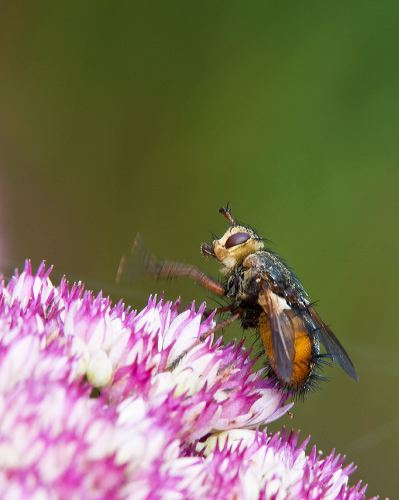 A parasitic fly (Tachina fera) cleans pollen from its fore-legs on a Sedum spectabile flower.