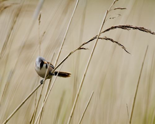 A Bearded Tit (Panurus biarmicus) balances on a reed stem