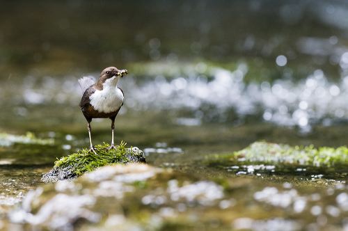 DIPPER, (Cinclus cinclus), with bill full of food pauses mid-stream with bill full of invertebrates.