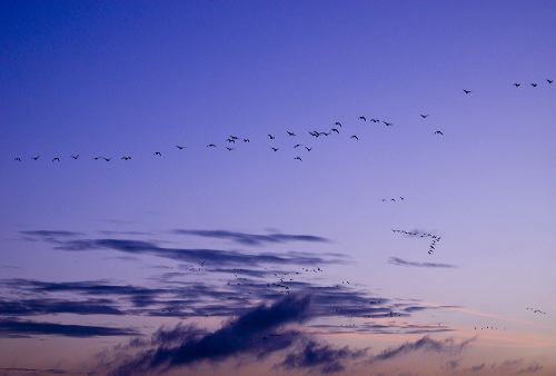 Skeins of Pink-footed geese (Anser brachyrhyncus) leave their roost at dawn