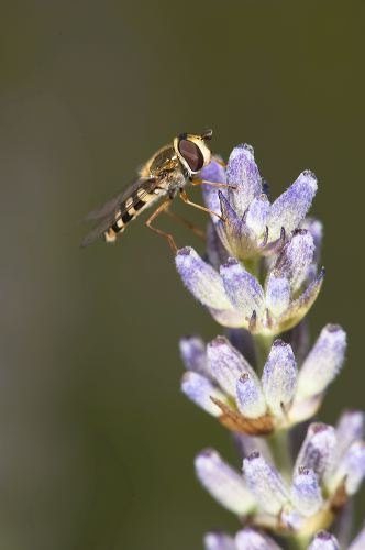A Hoverfly (Metasyrphus luniger) briefly rests on the tip of a Lavender spike