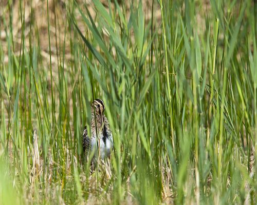 A Snipe (Gallinago gallinago) preening amongst the young new shoots of a reed bed.