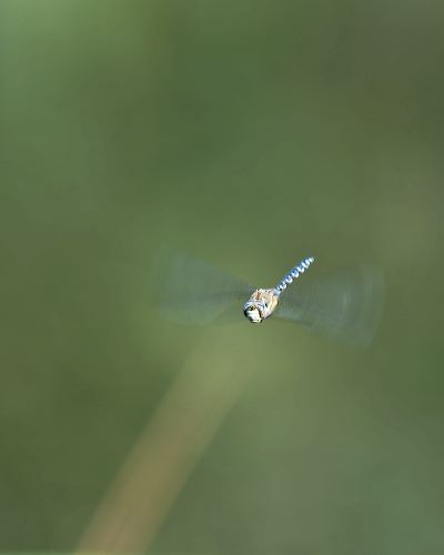 A Migrant Hawker Dragonfly (Aeshna mixta) flies towards an overhanging reed stem