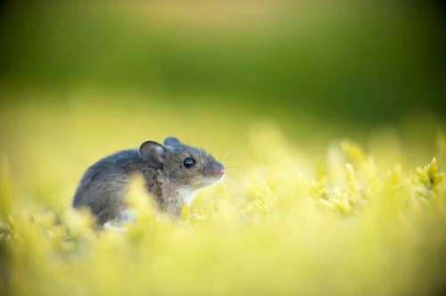 A Wood Mouse (Apodemus sylvaticus remains motionless to avoid the unwanted attention of some jackdaws overhead.