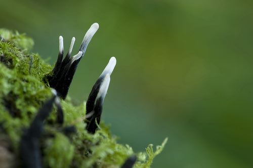Candle Snuff Fungus (Xylaria hypoxylon) emerging through moss on a decaying tree stump at Kenfig NNR