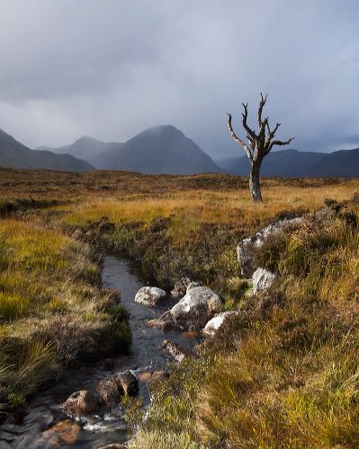 A burn runs past a dead tree on Rannoch moor.