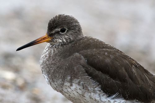 A Redshank (Tringa totanus), with rain drops settling on its back.