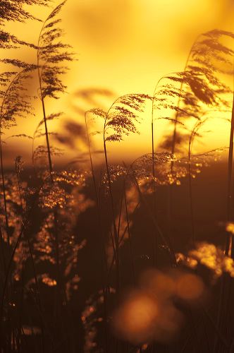 Reeds illuminated by the setting sun at Titchwell RSPB reserve North Norfolk.